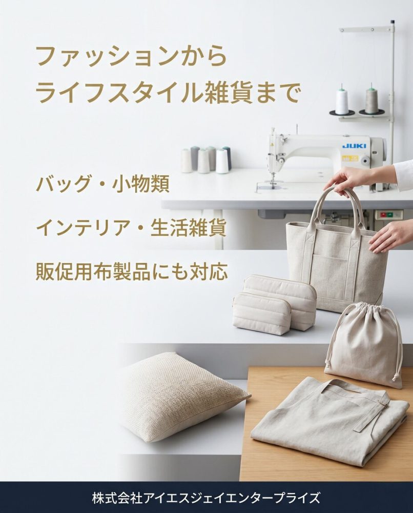 株式会社アイエスジェイエンタープライズは、国内縫製工場として、ファッションアイテムはもちろん、バッグ、小物、ライフスタイル雑貨、販促用布製品まで、幅広いご相談に対応しています。