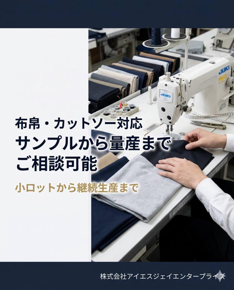 株式会社アイエスジェイエンタープライズでは、布帛・カットソーの両方に対応し、サンプル作成から量産まで柔軟にご相談を承っています。