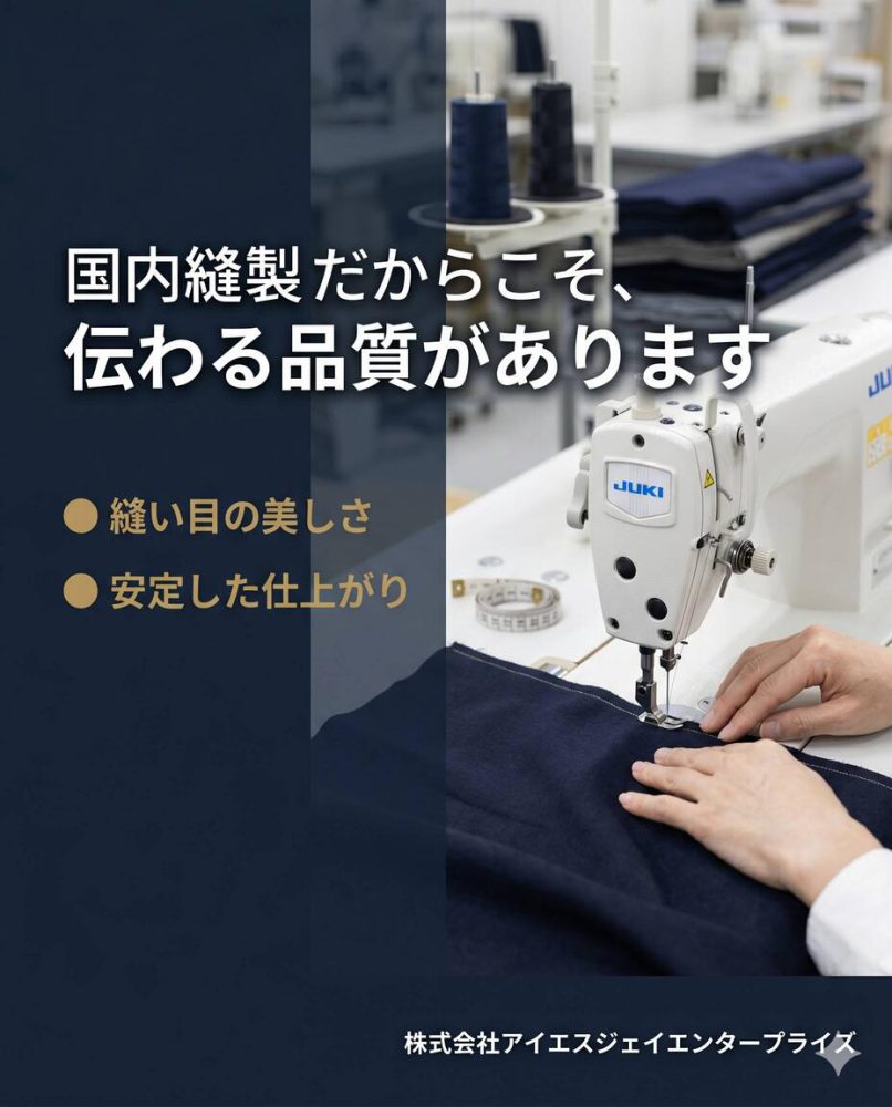 アイエスジェイエンタープライズでは、こうした国内縫製工場ならではの強みを活かしながら、品質を重視したものづくりを支えています。