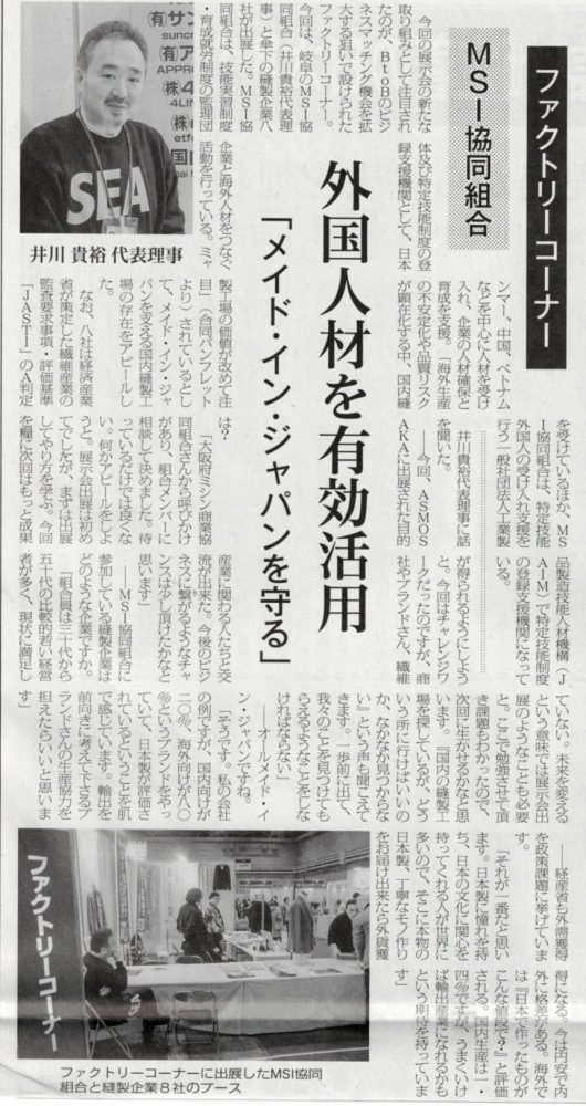 この度、「アパレル工業新聞」のASM OSAKA 2026レビュー企画において、当社代表の井川が代表理事を務めるMSI協同組合の取り組みが掲載されましたのでお知らせいたします。